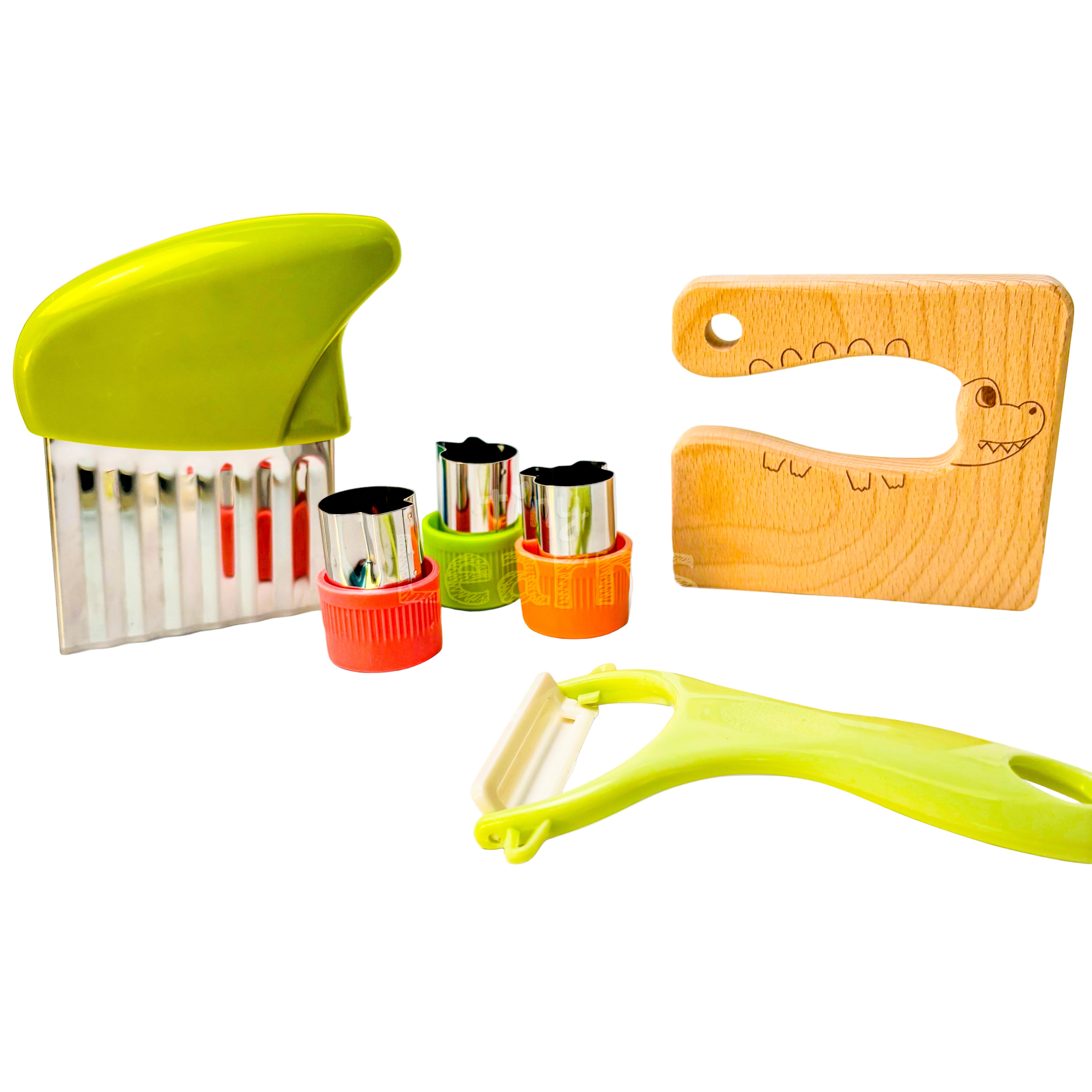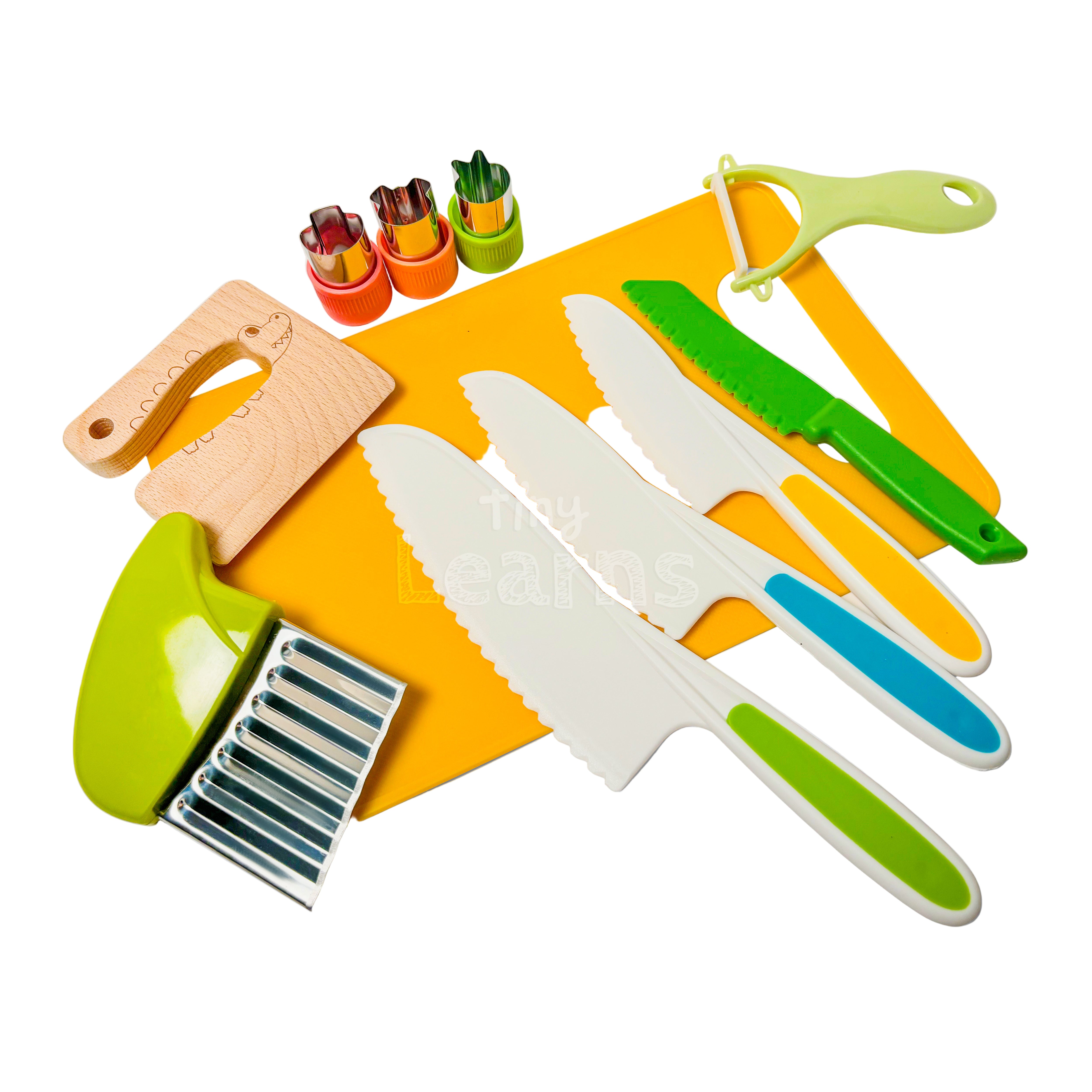 (Pieces include: 1 wooden knife, 3 child-friendly knives, 1 chopping board, 1 crinkle cutter, 4 fruit cutters, 1 Y-shaped peeler, 1 whisk, 1 pair of child-friendly scissors, 3 cake scrapers and 1 bear-shaped sandwich cutter)